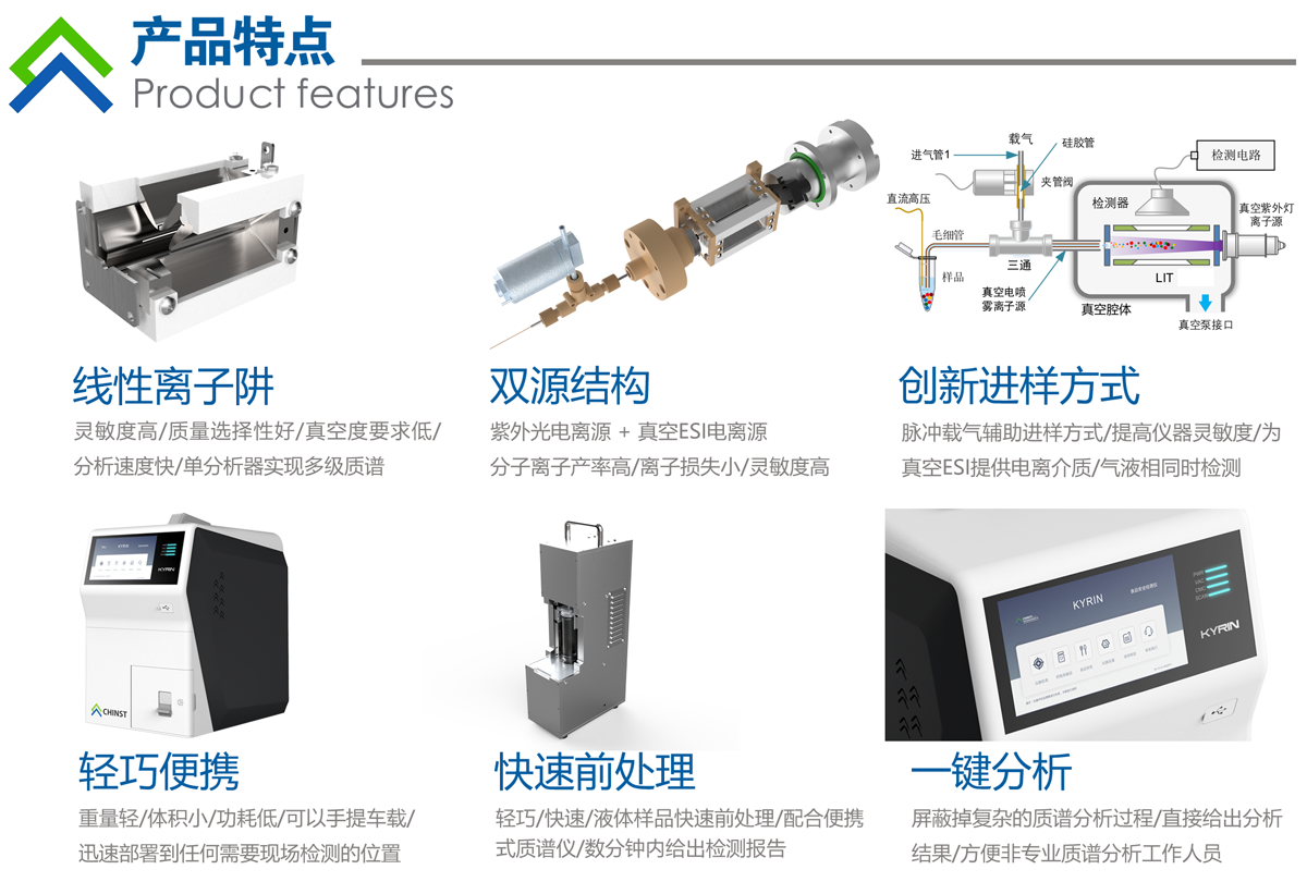 Kyrin2系列小型质谱仪以便携为设计目标,采用单个离子阱(LIT)质量分析器+真空电喷雾离子源(选配紫外光电离源)方案,使用脉冲载气辅助进样接口实现耦合,可以配置任何敞开式离子源实现气相、液相、固相分析。仪器体积小、重量轻,可以徒手搬运部署到应用位置。